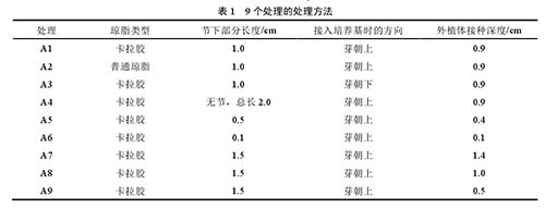 試驗(yàn)設(shè)計(jì)考慮了多種因素,按單因素設(shè)計(jì)實(shí)驗(yàn)方案。首先降低 MS 培養(yǎng)基中鉀離子濃度(降至標(biāo)準(zhǔn)培養(yǎng)基 60%,含硝酸銨 1 971 mg/L,硝酸鉀 1 090 mg/L),培養(yǎng)基的凝固劑分別使用卡拉膠 3 g/L 和普通瓊脂 8 g/L;外植體莖段分帶節(jié)和不帶節(jié)處理,不帶節(jié)處理中外植體長(zhǎng)為 2 cm,接種深度為 0.9 cm 左右;帶節(jié)外植體的節(jié)下部分設(shè)置 3 種長(zhǎng)度,為 1.5,0.5,0.1 cm,接入培養(yǎng)基的深度分別為 1.4,0.4,0.1 cm;外植體莖段分別進(jìn)行芽朝上或芽朝下(正插和倒插)方式進(jìn)行接種;節(jié)下部分長(zhǎng)度為 1.5 cm 的外植體接入培養(yǎng)基的深度設(shè)置 3 種處理,為 0.4,0.9,1.4 cm。實(shí)驗(yàn)所用的器皿為試管(長(zhǎng) 23 cm,直徑為 3 cm,容積 100 mL),每支試管均含培養(yǎng)基約 60 mL 左右,外植體的節(jié)上部分長(zhǎng)度均為 1 cm,節(jié)間直徑為 0.15 cm左右,去掉葉片后保持垂直或略帶傾斜接入培養(yǎng)基,每支試管接入外植體(扦插)一個(gè),培養(yǎng)溫度為(26±1)℃,光照時(shí)長(zhǎng) 14 h,外植體的地上部分的光照強(qiáng)度為 1 600~1 800 lx,地下部分(根系生長(zhǎng)部分用泡沫紙板進(jìn)行遮光)的光照強(qiáng)度為 270 lx 左右。實(shí)驗(yàn)共 9 個(gè)處理,每個(gè)處理共 10 個(gè)重復(fù),共培養(yǎng) 9×10=90個(gè)植株。