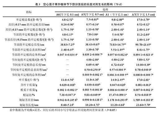 外植體節(jié)下長(zhǎng) 1.5 cm 處理(A7)的不定根總數(shù)、節(jié)部不定根總長(zhǎng)度和總表面積、節(jié)間處不定根的總體積、根系干質(zhì)量、葉片數(shù)、莖葉干質(zhì)量、匍匐莖直徑和長(zhǎng)度都顯著高于其他處理(P<0.05),這些指標(biāo)隨著外植體節(jié)下部分莖段長(zhǎng)度的增加呈現(xiàn)出遞增的趨勢(shì)。外植體節(jié)下部莖段長(zhǎng) 0.1 cm 時(shí),節(jié)間處不發(fā)生不定根;外植體節(jié)下部莖段長(zhǎng) 0.5,1,1.5 cm 處理中,節(jié)間處不定根的總體積存在顯著差異(P<0.05),但在數(shù)量上沒有顯著差異(P>0.05)(表 3),節(jié)間處不定根沒有發(fā)現(xiàn)膨大現(xiàn)象。由此可見,空心蓮子草節(jié)下部分長(zhǎng)度對(duì)其根系和莖葉部分生長(zhǎng)具有重要影響。