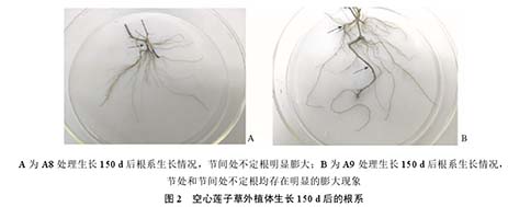 外植體培養(yǎng) 70 d,發(fā)現(xiàn)有部分不定根出現(xiàn)膨大趨勢(shì)。繼續(xù)培養(yǎng) 80 d(共 150 d),筆者觀察到空心蓮子草不定根出現(xiàn)明顯膨大。這說明組培條件下,空心蓮子草具有膨大形成貯藏根的能力。因此,本實(shí)驗(yàn)成功構(gòu)建了研究空心蓮子草莖段不定根膨大的組織培養(yǎng)體系,為進(jìn)一步在組培條件下開展空心蓮子草貯藏根的形成機(jī)理提供依據(jù)。