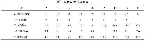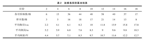 本研究以不同徑階的胡楊、灰楊代表其不同的發育階段。徑階劃分以及標準木確定方法為:以胸徑相差2 cm為標準進行規劃,起始徑階為2 cm。將研究區內 355株胡楊劃分為 2徑階、4徑階、6徑階、8徑階、10徑階、12徑階、14徑階、16徑階、18徑階(9個徑階代表了胡楊9個發育階段)。研究區內共有灰楊301株,劃分方法與胡楊相同,在胡楊、灰楊2~18 cm徑階分別選取3株作為重復,胡楊、灰楊標準木各27株見表1、表2。
