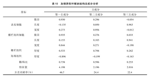 從表 10 可以得出,提取出的信息量占總信息量的 93.5%。 其 中 第 一 主 成 分 占 總 變 異 貢 獻 率 的46.7%,對第一主成分影響最大是表皮細胞數、柵欄組織細胞數、海綿組織厚度;第二主成分對總變異的貢獻率為 24.4%,對第二主成分影響最大的結構性狀是表皮細胞寬度、柵欄組織厚度;第三主成分占總貢獻率的 22.4%,對第三主成分影響最大的性狀是表皮細胞長度、柵欄組織細胞長度。表皮細胞數、海綿組織厚度、柵欄組織厚度及柵欄組織細胞數是決定灰楊不同發育階段異形葉結構差異的主要內在因素。