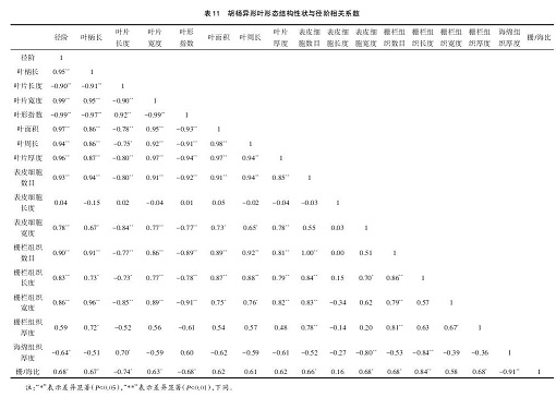表 11 顯示,胡楊葉柄長、葉片寬度、葉面積、葉周長、葉厚度、表皮細胞數目、表皮細胞寬度、柵欄組織數目、柵欄組織長度、柵欄組織寬度與徑階呈極顯著正相關(P<0.01),柵海比與徑階呈顯著正相關(P<0.05),而葉片長度、葉形指數與徑階呈極顯著負相關,海綿組織厚與徑階呈顯著負相關,結果表明胡楊異形葉形態結構性狀與徑階有密切的相關性,即與胡楊不同發育階段有關聯。