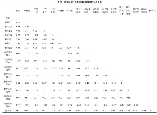 從表 12可以看出灰楊葉柄長、表皮細胞數目、表皮細胞寬度、柵欄組織數目、柵欄組織寬度、柵欄組織厚度、柵海比與徑階呈極顯著正相關(P<0.01),葉面積、葉周長與徑階呈顯著正相關(P<0.05),而海綿組織厚度與徑階呈極顯著負相關。表明葉柄長、葉面積、葉周長及在葉片最寬處橫切面表皮細胞長度、表皮細胞寬度、柵欄組織長度、柵欄組織厚度、海綿組織厚度、柵海比隨徑階的增加而增加。說明灰楊形態結構性狀與徑階具有一定的關聯性。