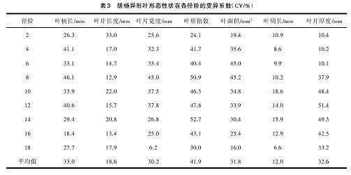 從表 3 看出,胡楊異形葉 7 個形態性狀在各徑階的變異系數平均值,從大到小依次為:葉形指數、葉柄長度、葉片厚度、葉面積、葉片寬度、葉片長、葉周長,說明各徑階均是葉形指數變異最大(CV=41.9%),說明不同徑階的胡楊異形葉形態差異較大;其次是葉柄長度、葉片厚度、葉面積變異系數較大。葉片寬度變異系數大于長度變異系數,表明葉片寬度變化比長度變化更豐富,而葉片長寬的變化間接影響到葉面積的變化,從而導致葉面積的變異較大。