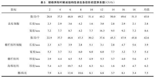 2.1.2 胡楊異形葉解剖結構性狀主成分分析從表 5可以看出,胡楊異形葉解剖結構性狀在各徑階的變異系數具有明顯的差異,葉片解剖結構性狀中 9個指標均有變異,其中變異系數最大的是柵欄組織細胞數和表皮細胞數。