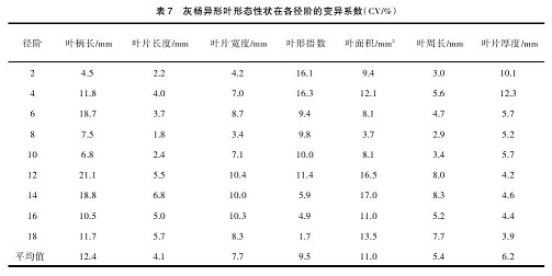 2.2.1 灰楊異形葉形態性狀主成分分析對灰楊異形葉的 7個形態性狀進行測量統計,發現灰楊異形葉的 7 個形態性狀在各徑階都存在不同程度的變異(表 7),變異系數平均值從大到小依次為: 葉柄長、葉面積、葉形指數、葉片寬度、葉片厚度、葉周長、葉片長度。變異系數最大的是葉柄長(CV=12.4%)說明不同徑階間異形葉葉柄長度變異較大;其次變異系數較大的是葉面積(CV=11.0%),葉片寬度變異系數大于葉片長度變異系數,當葉片長度變異最小時,葉片寬度變異可能就成為影響葉面積變異的主要因素。