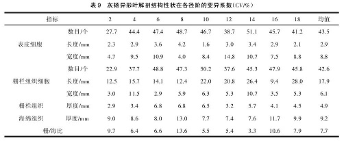 灰楊異形葉解剖結構性狀在各徑階的變異系數如表 9,在各徑階中,異形葉解剖結構性狀均是柵欄組織細胞數和表皮細胞數變異系數最大,說明各徑階異形葉解剖結構的變化主要體現在柵欄組織細胞數和表皮細胞數的變化上。