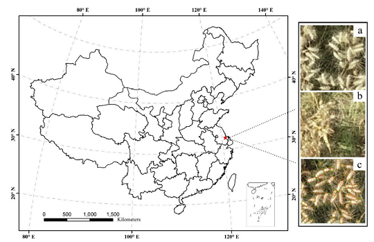 圖1 實驗地點和無人機的麥穗圖像。(a)清晰的圖像,(b)模糊的圖像,(c)人工標注的圖像。