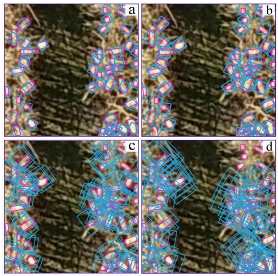 圖11在訓練過程中,用微尺度檢測層(a)、小尺度檢測層(b)、中尺度檢測層(c)和大尺度檢測層(d)實現的正樣本邊界框和麥穗邊界框。正樣本邊界框(淺藍色)。小麥穗的邊界框(粉紅色)。