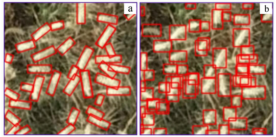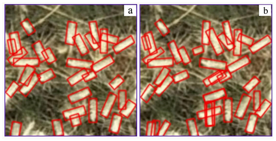圖12使用CIoU進行定位損失的模型的檢測結果(a)和使用IoU進行定位損失的檢測結果(b)。紅色邊框代表檢測結果。