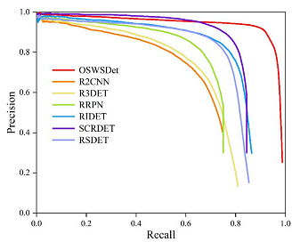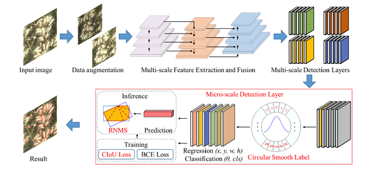 圖2 OSWSDet 的總體框架。紅色標簽是OSWSDet中提出的改進,包括 CSL(圓形平滑標簽)、微尺度檢測層、基于 CIoU(Complete Intersection over Union)和 RNMS(Rotation Non-Maximum Suppression)的優化定位損失。