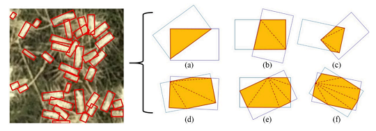圖4 兩個定向檢測框的 WIoU 計算。左圖顯示了小麥穗的定向檢測框,右邊的6幅圖像顯示了兩個重疊框之間重疊區域的形狀。根據形狀的不同,兩個重疊框有6種不同類型的黃色相交圖,可以用三角形的面積來計算WIoU:(a)相交圖是三角形,(b)相交圖是四邊形,(c)相交圖是五邊形,(d)相交圖是六邊形,(e)相交圖是七邊形,(f)相交圖是八邊形。