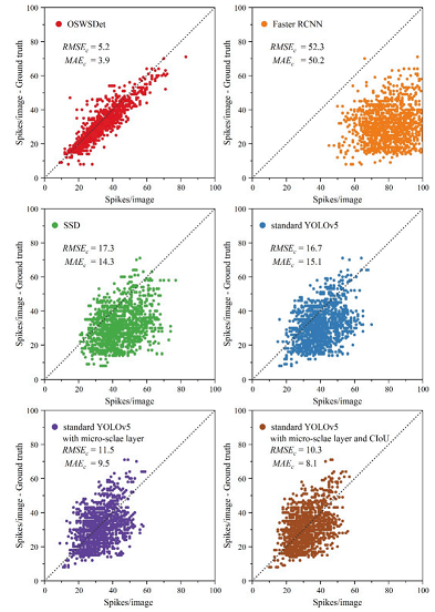 圖6圖像上標注的真實穗子數量與Faster RCNN、SSD、standard YOLOv5、standard YOLOv5with micro-sclae layer、standard YOLOv5with micro-sclae layer and CIoU以及OSWSDet估計的穗子數量的比較。