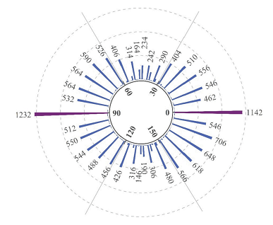 圖7 角度等級的小麥穗數從0到179,具有100個以上小麥穗的類標有特定編號。