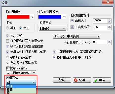 識別方式分成自動、橢圓、圓3種,橢圓是原有的識別方式,這種方式識別結果與抑菌圈邊緣貼合最好;圓是按抑菌圈最圓部分來識別,對不太圓的抑菌圈識別效果好;自動是兩者的綜合。3種方式識別出來的結果略有差異,具體見下面圖像。