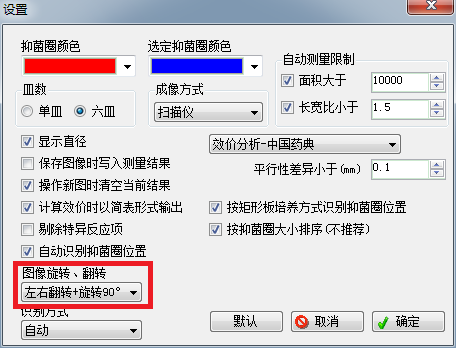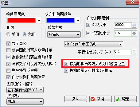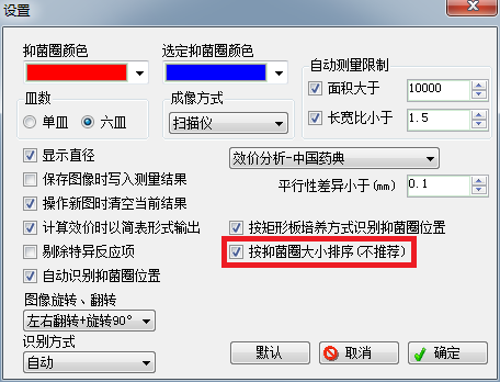 1、 按平板識別:如圖1紅框所示,選上【按平板培養方式識別抑菌圈位置】時,系統將會按平板方式識別抑菌圈位置(