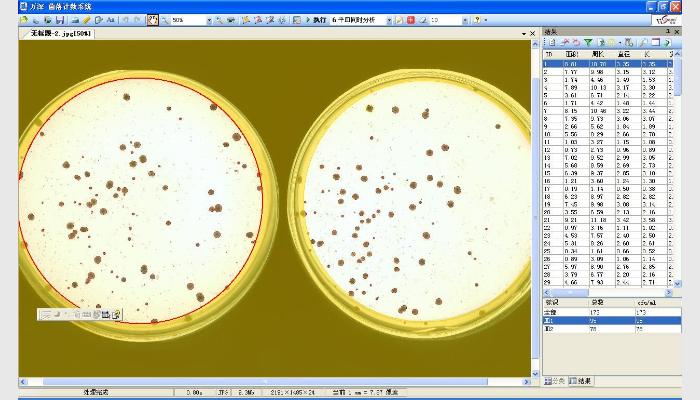 6、★自動分割相互成片粘連的長形、圓形等菌落目標,用戶可選擇分割或不分割。還可手動分割、合并菌落目標圖像。鼠標點擊修正,無痕剔除網(wǎng)格及文字,自動剔除雜質(zhì),有效支持復雜微生物統(tǒng)計,符合GB4789.2-2016的參數(shù)自動換算特性。