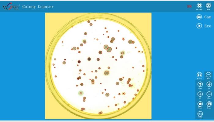 5, automatic counting accuracy ≥ 96.5%, with very few amendments up to 100% correct. Analysis speed: 50 - 300 colonies / s