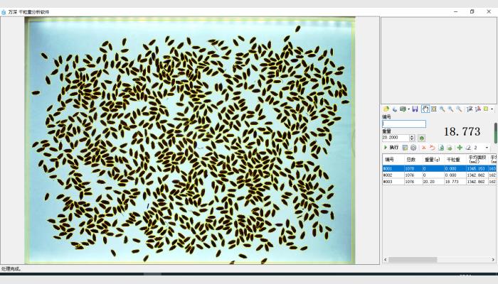 4、將種粒散放在背光板上的成像盤中拍照計數,再將種粒倒入收納小盒放到帶RS232通訊線的電子天平上,1秒鐘穩定后,即將重量數據送至電腦中分析系統對應的重量欄,算出該樣品種粒的千粒重值和平均粒形值。千粒重分析速度:1200~20000粒/分鐘。