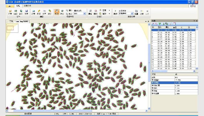 5、★能自動(dòng)測(cè)出各類粘連種粒的每粒粒形參數(shù)(長(zhǎng)、寬、長(zhǎng)寬比、面積、等效直徑、周長(zhǎng)等),能精準(zhǔn)顯示種粒外接矩形,并可自動(dòng)排序輸出,及可輸出粒徑分布圖表。