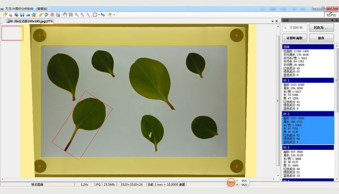 3、可分析小至1mm ^2的葉片,分析誤差<0.5%、測(cè)量中的分析時(shí)間<2秒,自動(dòng)獨(dú)立標(biāo)記各葉片并可保存圖,分析結(jié)果可輸出至Excel表。
