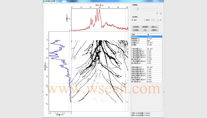 1)根總長;2)根平均直徑;3)根總面積;4)根總體積;5)根尖計數;6)分叉計數;7)交疊計數;8)根直徑等級分布參數;9)根尖段長分布,10)可不等間距地自定義分段直徑,自動測量各直徑段長度、投影面積、表面積、體積 等,及其分布參數;11)能進行根系的顏色分析,確定出根系存活數量,輸出不同顏色根系的直徑、長度、投影面積、表面積、體積。12)能進行根系的拓撲分析,自動確定根的連接數、關系角等,還能單獨地自動分析主根或任意一支側根的長度和分叉數等,可單獨顯示標記根系的任意直徑段相應各參數(分檔數、檔直徑范圍任意可改,可不等間距地自定義),并能進行根的分叉裁剪、合并、連接等修正,修正操作能回退,以快速獲得100%正確的結果。13)能用盒維數法自動測根系分形維數??煞治龈鼍w積在根系中的占比,以客觀確定根瘤菌體貢獻量。14)大批量的全自動根系分析,對各分析結果圖可編輯修正。15)能做根系生物量分布的大批量自動化估算。16)具有向地角分析、路徑分析、主根提取分析特性。17)能自動測量油菜、大豆等果莢的果柄、果身、果喙部分的粗細、長、弧長、玄高等參數。18)能自動測量各種粒的芒長。19)能測各類針葉的葉面積、長度、粗細。20)各分析圖像、分布圖、結果數據可保存,分析結果輸出至Excel表,可輸出分析標記圖。