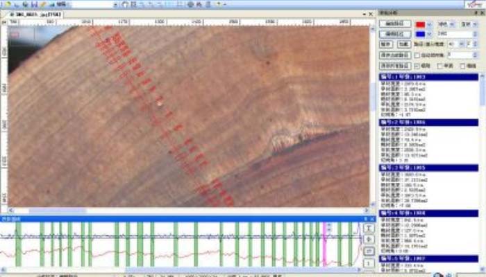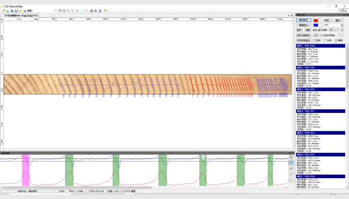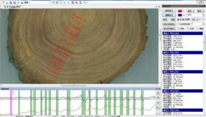 (1)可自動判讀年輪數、各年輪平均寬度、早材及晚材寬度、各年輪切向角度和面積、可自動劃分出年輪邊界、早材邊界、晚材邊界,以及識別出很窄的樹輪。可交互刪除偽年輪、插入斷年輪,