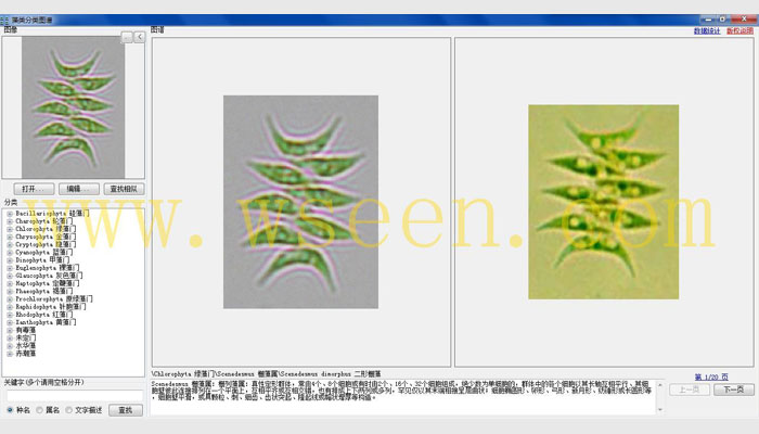 4)★藻類、浮游動物智能鑒定:具有按相似度自動比對浮游生物圖像的圖像式智能搜索特性。通過形態學搜索、關鍵詞搜索、常見浮游生物搜索、分類學搜索,經圖像、文字對比,快速鑒定浮游生物。能自動索引浮游生物的用戶計數表成所在流域小圖庫,使【以圖搜圖】更快捷。具有橈足類P5搜索特性。